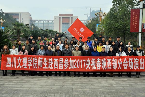 荣登央视春晚舞台,同学们无疑是幸运的,兴奋之情溢于言表,同时也是辛苦的。学校在2016年12月接中共四川省委宣传部、省教育厅的通知后,即在音乐与演艺学院选拔了37名优秀学生和2名带队教师赴2017春晚凉山分会场排练和演出,学校党委书记王洪辉、校长王成端、党委副书记侯忠明在临行前曾寄语师生发扬文理精神,以专业的功底、出色的演出、良好的精神状态展示文理风采,向全国人民拜年。
