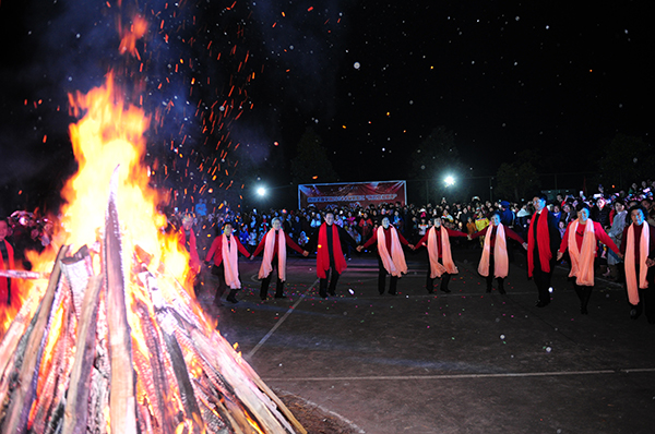 党委书记王洪辉点燃篝火,闪烁的火光驱散了夜幕,照亮了每一个人的笑脸,整个操场变成一片欢乐的海洋。