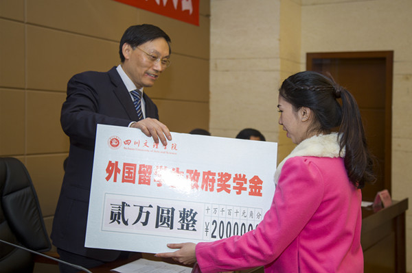 11月29日下午,学校在莲湖校区行政楼一楼会议室隆重举行四川省外国留学生政府奖学金颁奖大会,为2016年四川省外国留学生政府奖学金获得者苏龙和英提同学颁发奖学金及获奖证明书。