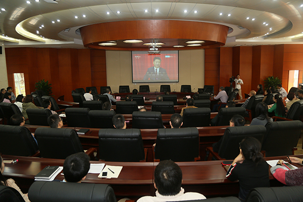 根据学校安排,机关各部门工作人员在行政楼二楼、底楼集中收看,二级学院组织师生在各学院会议室集中收看。