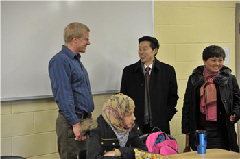 期间,孟兆怀一行在东门洛大学国际处处长Myrrl Byler的陪同下,参观了该校校园、图书馆、语言文学系、英语语言培训中心、多媒体中心等,语言文学系主任Dr.Mike Medley、英语语言培训中心主任Kathleen Roth女士分别向孟校长一行介绍了专业设置、师资队伍和课程建设以及语言培训教学与实践教学等方面情况,并就学生专业技能培养、语言教学和学生就业等问题进行了深入交流。在多媒体中心和英语语言培训中心,孟兆怀一行参观了视觉传达艺术专业学生作品展,观摩了语言培训课堂教学,鼓励在学的留学生学好汉语,有机会到中国来留学。孟兆怀一行还顺访了詹姆士麦迪逊大学,会见了该校国际培训中心主任Adam L . Copeland先生,了解了该校国际培训中心和国际学生申请硕士学位等有关要求,并在中心工作人员魏红女士陪同下参观了校园。