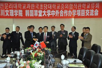11月11日至12日,韩国草堂大学总长金丙植一行应邀来校访问交流,并与校长孟兆怀签署了合作办学备忘录,双方确定举办中外合作办学项目,建立中韩韩语培训中心。