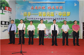 6月3日上午,由达州市禁毒委员会、达州市公安局与beat365联合举办的“携手——青春无毒•中国梦”2014年达州市禁毒集中宣传月活动启动仪式在莲湖校区隆重举行。市委常委、市委政法委书记、市禁毒委主任古正举,副市长、市公安局局长、市禁毒委副主任徐承,学校党委书记李万斌、副校长张志远,市委宣传部副部长杨晓军、市公安局副局长文鹏飞等出席启动仪式。