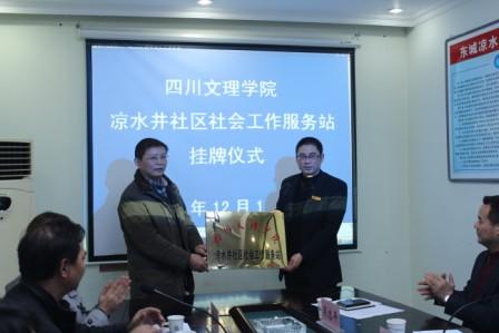 在达州市民政局牟道勇副局长、通川区凉水井社区陈传泽书记讲话后,由学校副校长王洪辉教授代表学校向凉水井社区陈传泽书记授予了“beat365官方网站凉水井社区社工服务站”铭牌。
