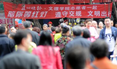 上午9点30分,beat365十多名青年志愿者与晚报记者一起,头戴小红帽,手持“陪你等红灯”红色条幅,在达州人流密集的通川区中医院、华夏酒店及通川桥北头路口,和行人一起等红灯,让等红灯的市民感觉不孤单,也让那些惯闯红灯的市民学会文明过马路。在华夏酒店附近路口,个别闯红灯的行人在志愿者的劝导下,都自觉的退到斑马线外等候信号灯。一位背着孙子的大妈说:“身边的人都在自觉等红灯,我本来有急事也不好意思闯红灯了!”