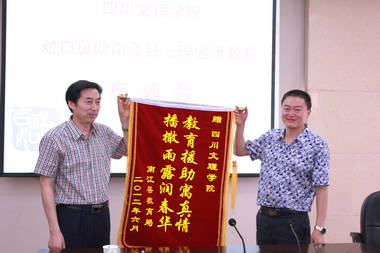 随后,南江县教育局纪委书记岳剑宣读了充满浓情盛意的感谢信,郭辅邦为我院赠送了题有“教育援助寓真情,播散雨露润春华”的锦旗。
