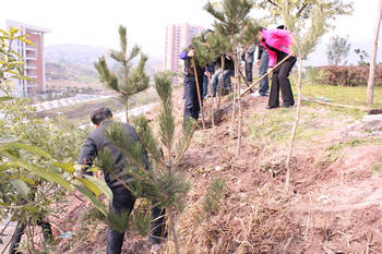 参加植树活动的教师携带工具早早来到山头,大家分工协作,有的搬树,有的浇水,有的覆土,有的协助,干得热火朝天。在基建处有关技术人员的指导下,大家科学、有序的栽植,学院领导还不时与参加植树的教师交流经验,谈笑风生,并要求有关部门要加强管理,保证存活率,使凤祥山变得更加美丽。在大家的辛勤劳动下,经过近一个小时,共栽植了100多棵松树和杉树。