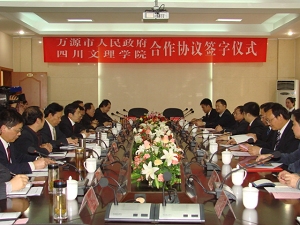 4月26日,我院与万源市人民政府市校合作签字仪式在莲湖校区行政楼3楼会议室隆重举行。双方约定,将本着优势互补、互惠互利、合作共建、共谋双赢的原则,在课题研究、旅游开发、科研教学、人才培训等领域建立全面、紧密的市校合作关系。