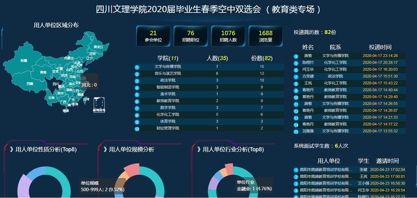 为确保本次教育类专场空中双选会的顺利开展,学校在前期加大宣传力度,广泛动员有志于从事教育事业的毕业生积极参与。就业指导服务中心积极筹备,主动对接用人单位,通过电话回访、教师联系、征集校友资源等方式,广泛开拓就业渠道,邀请用人单位参与。双选会上,40余家教育类用人单位提供岗位1076个,各二级学院毕业生积极投递简历参与应聘,效果良好。后期学校将持续跟进本场空中双选会的后续进展和落实成效,持续深化与行业内相关单位的交流,继续搭建线上招聘平台,适时举办线上线下不同类别、不同规模的招聘会,为毕业生提供更多、更高质量的就业机会,推进2020届毕业生高质量充分就业。