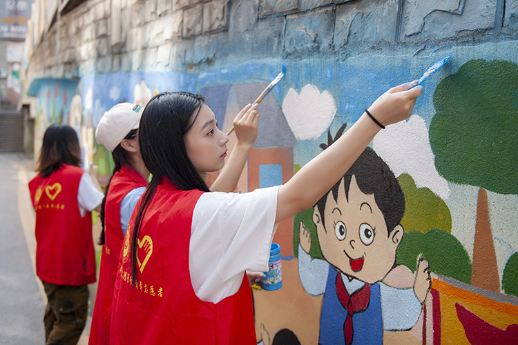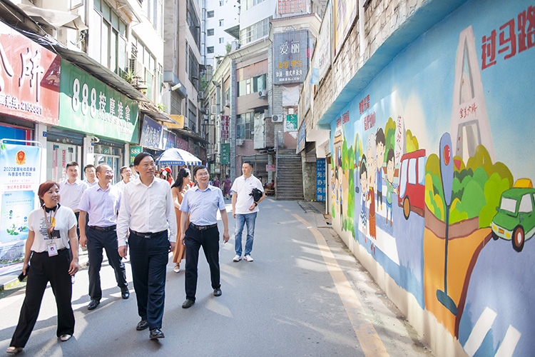 交流会后,王成端参观验收了beat365美术学院志愿者为社区绘制的墙画。