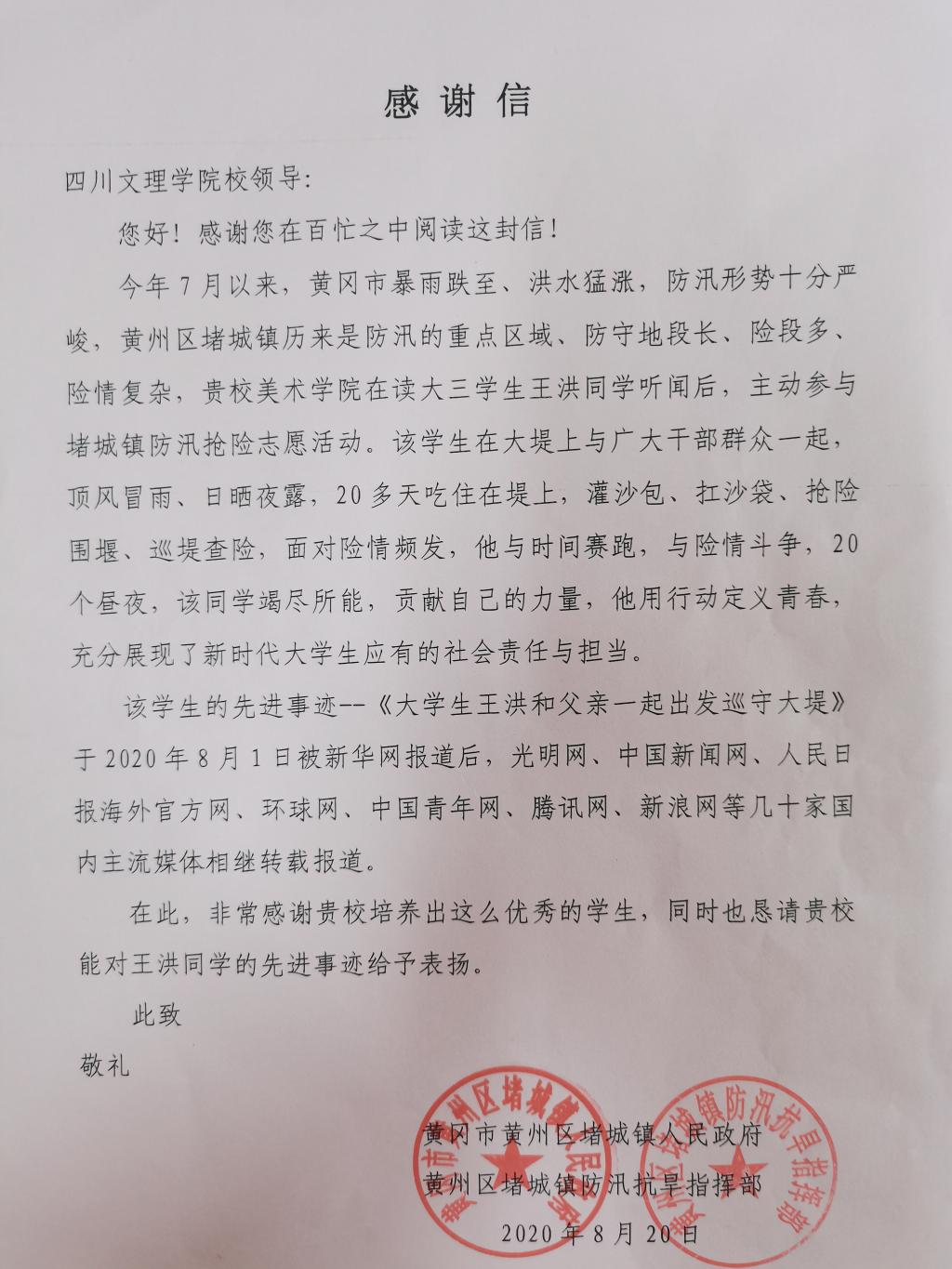 9月26日上午,黄冈市黄州区堵城镇人民政府、黄州区堵城镇防汛抗洪抗旱指挥部向学校寄来感谢信,对beat365美术学院大三学生王洪同学在家乡踊跃参与抗洪抢险,勇于担当奉献,面对灾情冲锋在前的积极表现予以感谢与称赞。