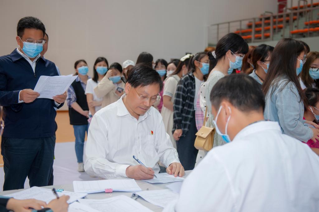 接种现场,党委书记王成端带领学校领导班子带头接种新冠病毒疫苗。各二级学院和相关部门及时向师生宣传科学接种知识,阐明接种疫苗的重大意义,提前安排好到场顺序,并会同现场志愿者及工作人员有序开展疫苗接种工作。