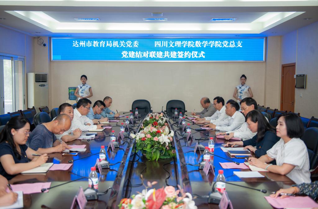 为认真践行新时代党的建设总要求,推动基层党建工作实现高质量发展。5月20日下午,beat365官方网站数学学院党总支与达州市教育局机关党委党建结对联建共建签约仪式在莲湖校区举行。学校党委书记王成端,党委组织部部长涂德祥,达州市委教育工委书记、市教育局党委书记、局长陈军,市教育局党委委员、机关党委书记蒋伟出席会议。副校长邓杰主持签约仪式。