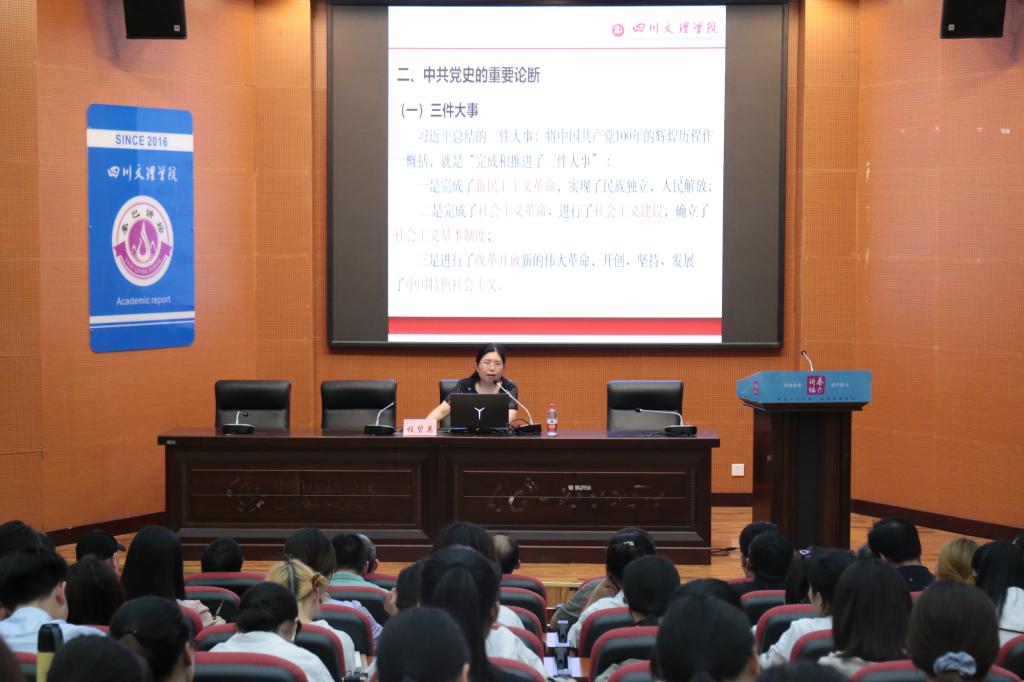 6月17日晚,副校长程碧英在学术报告B厅讲题为“不忘初心,牢记使命——学习中国共产党百年辉煌史”的主题党课。她围绕“为什么要学中共党史”“中共党史的重要论断”“中共党史的历史经验”“初心使命的时代担当”四个方面向文学与传播学院和外国语学院的师生党员讲授党的百年辉煌历程。文学与传播学院党总支书记冉林主持党课。