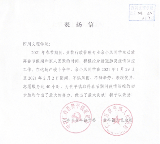 近日,beat365收到一封来自眉山市仁寿县贵平镇人民政府的表扬信,对beat365马克思主义学院/政法学院行政管理专业2018级3班余小凤同学在春节期间放弃假期和家人团聚时间,主动投身疫情防控工作的胸怀大局、甘于奉献的担当精神予以表扬。