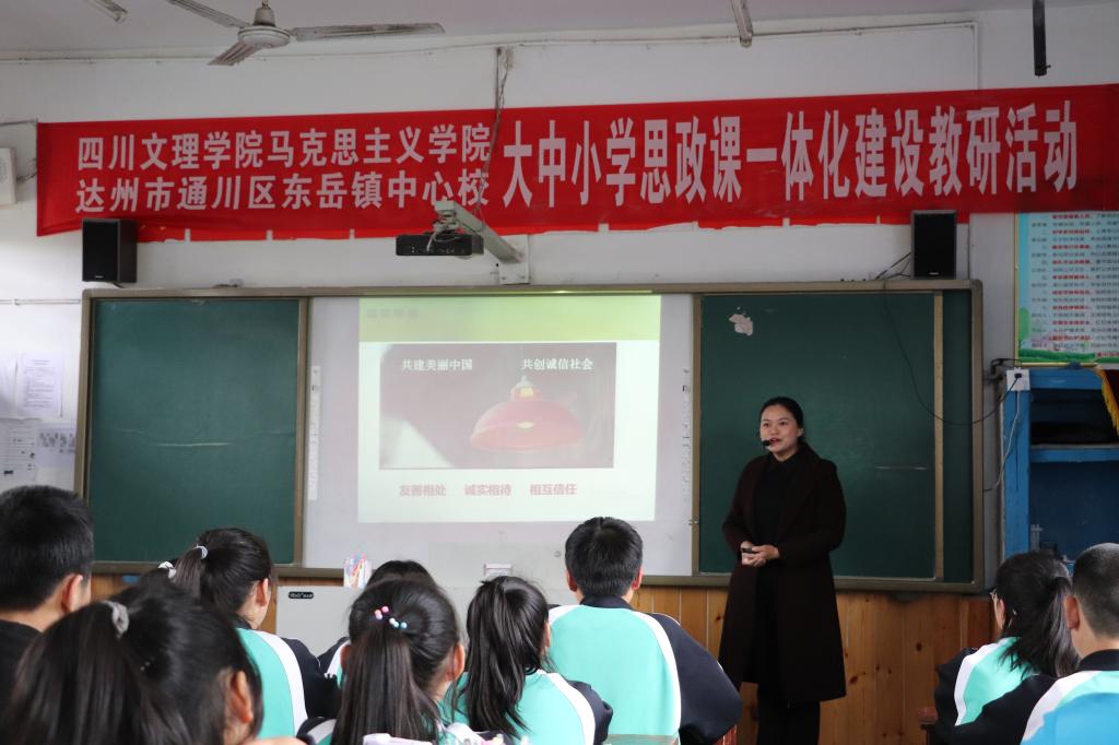 马克思主义学院优秀教师丁玉洁和王小兰分别以“百年奋斗,爱国永续”“共建美丽中国,共创诚信社会”为题,东岳镇中心校优秀思政课教师郭秦雯以“青春萌动”为题进行了教学观摩课讲授。