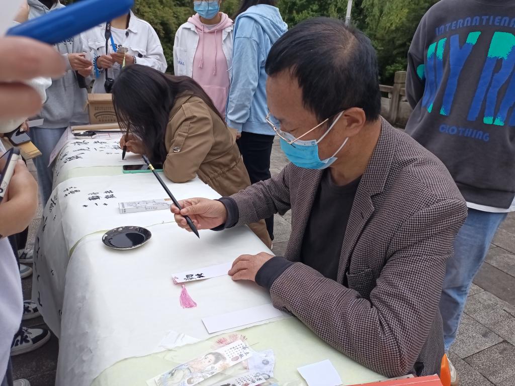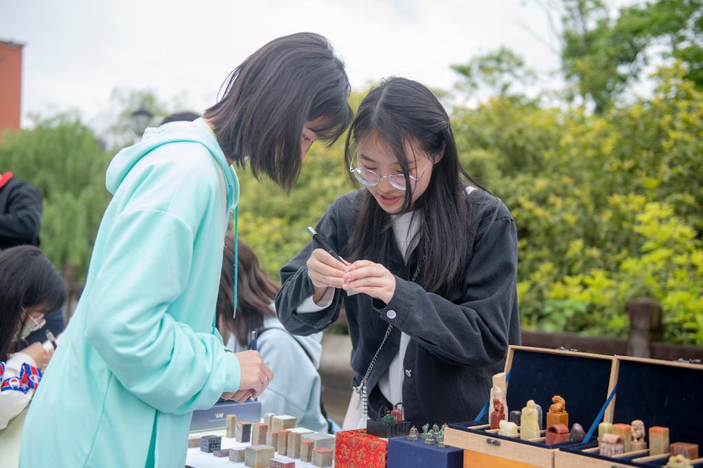 书法艺术是中华文化中十分独特的艺术瑰宝。它不仅可以陶冶情操,更能集中展现中华民族的传统美。广场上有好几个展台上都是书法篆刻作品,还有几位爱好者正拿刻刀刻石头,有的正在全神贯注地写毛笔字。