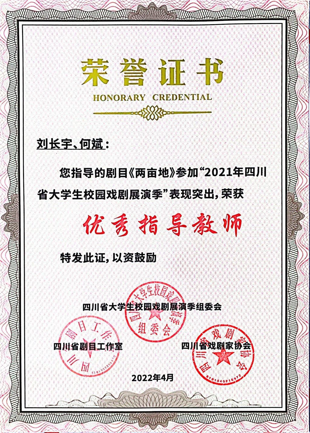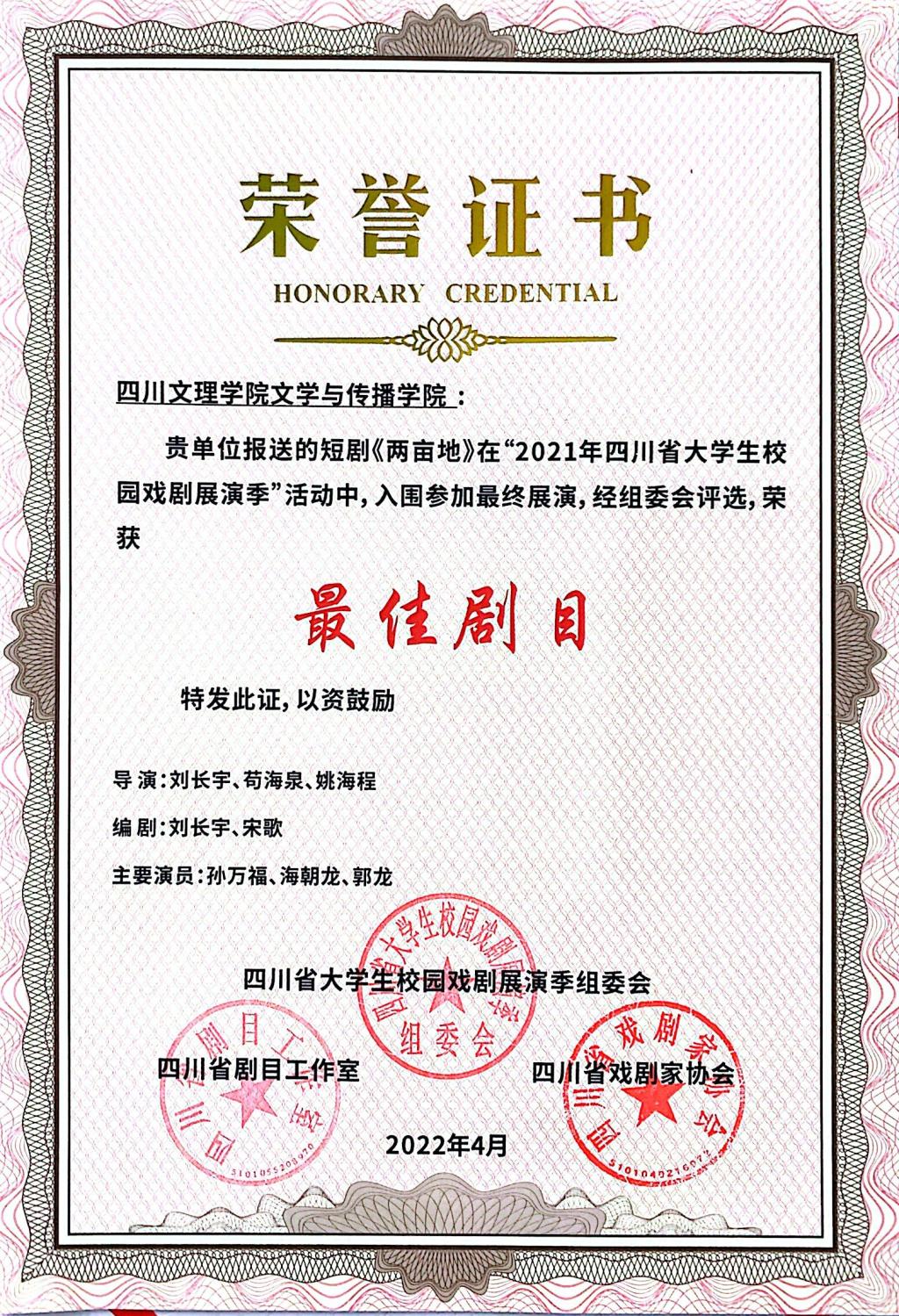 近日,2021年四川省大学生校园戏剧展演季圆满落下帷幕,文学与传播学院选送的戏剧小品《两亩地》荣获最佳剧目和最佳人气两项大奖,刘长宇、何斌两位老师获得“优秀指导教师”的荣誉称号。