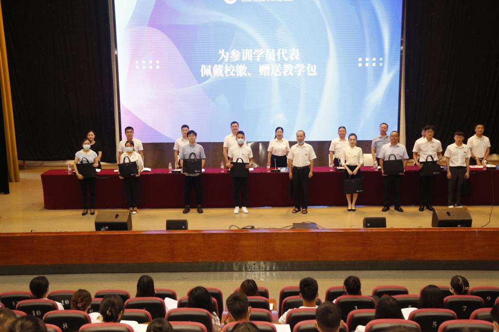 与会领导为参训学员代表佩戴校徽并赠送教学工具包。党委(校)办公室主任陈官章宣读培训班班委及组长名单。教师教学发展中心主任叶怀凡介绍培训总体安排。参训学员刘德强博士代表全体新入职教师发言。