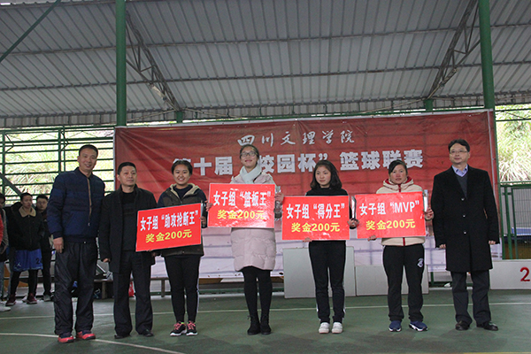 在今年新设置的个人奖项中,马克思主义学院、政法学院勒尔几吾、建筑工程学院刘昊煜、数学学院蒲俊臣、美术学院李金舟同学分别获得男子组“MVP”、“得分王”、“篮板王”、“抢断助攻王”的称号。财经管理学院苏妲婉、教师教育学院彭海燕、外国语学院黄利平、马克思学院、政法学院邓海馨同学分别获得女子组“MVP”、“得分王”、“篮板王”、“抢断助攻王”的称号。刘勇等十名同学获得“优秀裁判员”的称号。