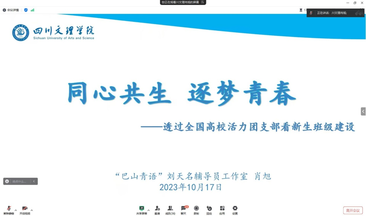 为深入贯彻落实习近平总书记关于教育的重要论述,提升辅导员工作素养,推动辅导员队伍专业化建设,10月17日晚,四川省“微光青语”张邵希名辅导员工作室、“巴山青语”刘天名辅导员工作室、“蓉融”卢立文名辅导员工作室、“同心筑梦”黄占波名辅导员工作室、“蓉青筑梦”王丽英名辅导员工作室等五个名辅导员工作室联合推出的《工作室大家说》通过腾讯会议正式开讲。