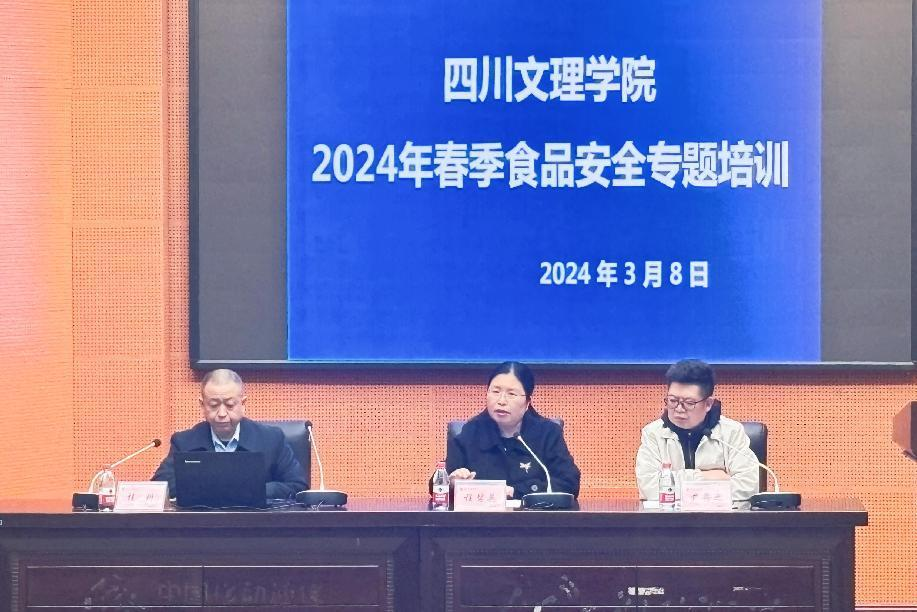 为加强学校食品安全管理工作,进一步提高学校食品安全管理水平,规范食堂从业人员操作程序,掌握必要的食品安全知识,确保“舌尖上的安全”,3月8日,学校食品安全专题教育培训会在莲湖校区学术报告B厅召开。培训会邀请达州市达川区翠屏市场监督管理所王洪杰所长一行为beat365餐饮及超市从业人员进行专题培训。副校长程碧英出席会议并讲话。