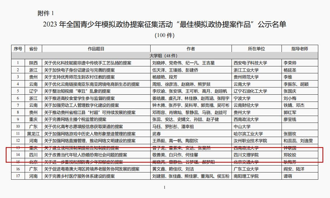 2023年全国青少年模拟政协提案征集活动开始以来,校团委高度重视本次活动的宣传和指导工作,在充分发挥政法学院、知识产权学院专业师资优势和基层共青团组织动员优势的基础上,依托学生模拟政协协会组织开展了beat365官方网站2023年全国青少年模拟政协提案征集活动专项校赛。本次活动参与人数达400余人次,实际提交作品128份,推荐达州市优秀提案作品51份。活动在学生群体引发热烈反响,相关成果取得良好成效。