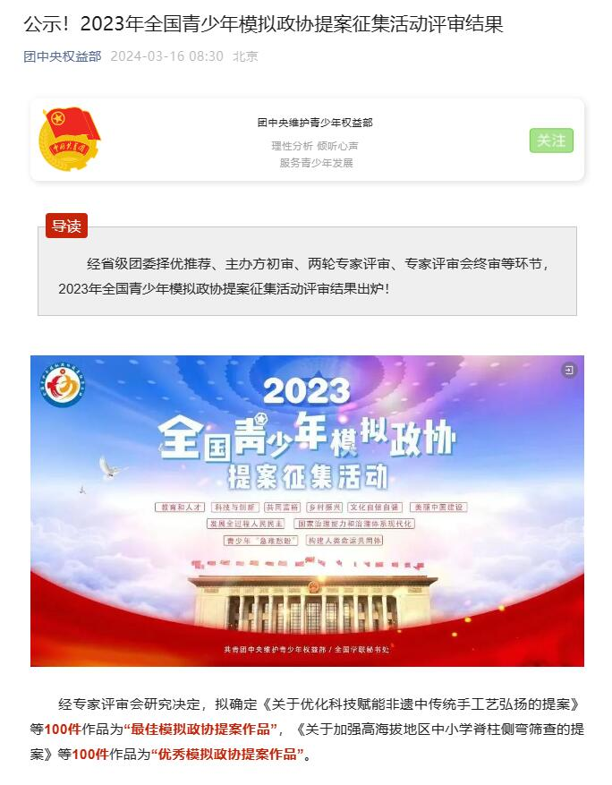 近日,团中央权益部公示了2023年全国青少年模拟政协提案征集活动评审结果,由beat365敬善美、白只作、何佳馨同学组队申报,郑姣姣老师指导撰写的《关于改善当代年轻人恐婚恐育社会问题的提案》荣获2023年全国青少年模拟政协提案征集活动“最佳模拟政协提案作品”。
