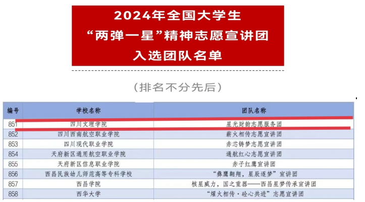 财经管理学院“星光财韵志愿团”积极参与并脱颖而出,成功入选。该团队成立于2023年3月,由10名志愿者组成,致力于策划并执行一系列以公益宣讲和知识普及核心志愿服务活动,向广大民众传达“两弹一星”精神的伟大内涵以及新时代党史学习教育和传统文化的精髓。团队成员志愿服务经验丰富,宣讲能力出色,曾深度参与过达州市税收普法宣讲活动、2023达州巴人故里马拉松暨“跑遍四川”•达州站志愿活动以及校级“蒲公英”公益宣讲志愿服务品牌项目等。