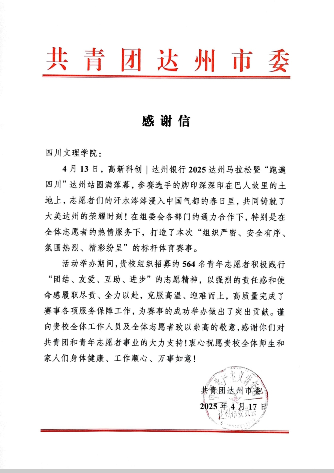 活动结束后,学校收到了共青团达州市委的感谢信。信中,团市委对志愿者们在2025年达州马拉松季活动中的出色表现给予了高度肯定和诚挚感谢。信中表示,志愿者们以高度的社会责任感、严谨的工作态度和热情周到的服务,为赛事的顺利举办提供了有力保障,充分展现了新时代青年的良好精神风貌,为达州市的城市形象增添了光彩。