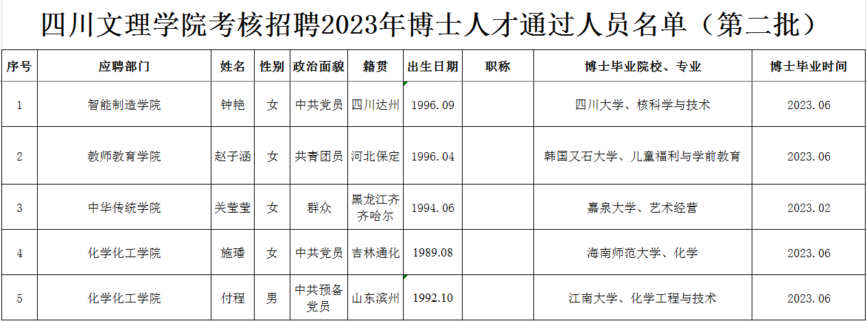 按照《beat365官方网站高层次人才引进与管理办法》(川文理委〔2019〕84号),经过初试(初审)、复试考核程序,现将beat365官方网站考核招聘2023年博士人才通过人员名单(第二批)予以公布,请报考者注意查阅。