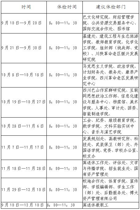 为进一步方便教职工安排时间前往体检,本次体检由集中体检和分散体检相结合的方式进行。集中体检时间表见下表,分散体检可由教职工根据工作情况,在体检时间段内自行前往体检医院体检。