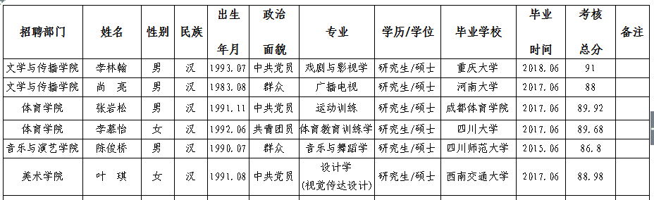按照《beat365官方网站2018年考核招聘博士、艺体类和小语种类人才公告》,考核小组对应聘beat365专任教师进行了考核。经学校研究,现将考核结果公示如下,公示期限为7个工作日(2018年1月24日至2018年2月1日)。公示期间接受社会监督和举报,举报者应以真实姓名书面或电话向beat365官方网站人事处或纪委反映。监督举报电话:0818-2790077、0818-2790019, 邮箱:scwlrsc@126.com、jwjsc@sohu.com。