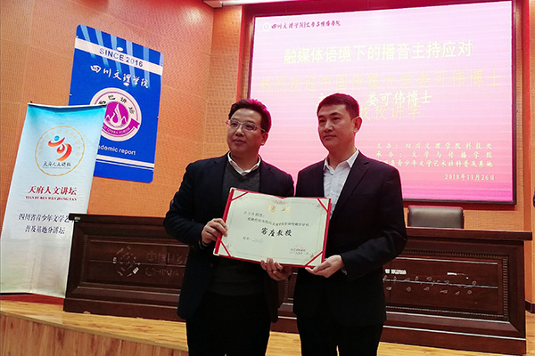 11月26日下午,中国工商银行驻川定点扶贫组组长、中共南江县委副书记、中国传媒大学博士娄可伟应文学与传播学院和四川省青少年文学艺术社科普及基地邀请,莅临学校作“融媒体语境下的播音主持应对”学术报告。副校长李壮成教授为娄可伟博士颁发客座教授聘书。