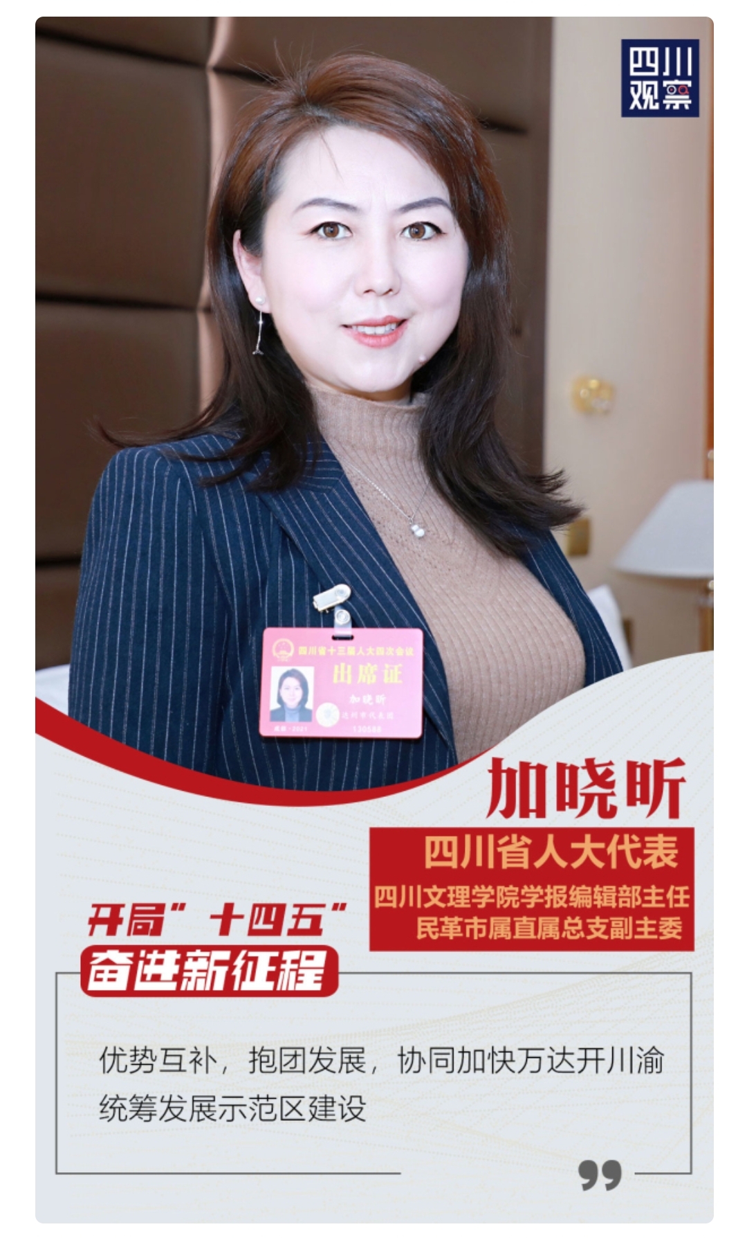 1月30日上午,四川省第十三届人民代表大会第四次会议在成都开幕。来自全省各地、各条战线的省人大代表齐聚一堂,依法履行宪法法律赋予的神圣职责,共商全面建设社会主义现代化四川大计。会议期间,四川省人大代表、beat365学报编辑部主任、民革市属直属总支副主委加晓昕教授接受了《四川观察》的采访,在提交的《关于支持建设“大巴山·大三峡”旅游环线的建议》中,深刻论证了协同创建万达开川渝统筹发展示范区,优势互补,抱团发展的理念。建议省委政府要加强资金、项目、土地等方面的支持力度,加快川渝城市一体化发展,省政府及省旅游局、省交通运输厅等省级有关部门支持达州推进“大巴山·大三峡”文化旅游环线建设,将相关重点项目纳入全省交通发展规划,并重点支持巴山大峡谷创5A级景区工作和八台山-龙潭河-巴山大峡谷旅游通道建设。
