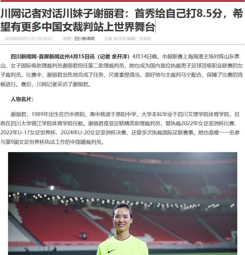4月14日晚,中超联赛上海海港主场对阵山东泰山,女子国际级助理裁判员谢丽君担任第二助理裁判员,她也成为国内首位执裁男子足球顶级职业联赛的女子裁判员。比赛中,谢丽君出色地完成了任务,尺度拿捏得当,很好地与主裁判马宁配合,保障了比赛的流畅进行。赛后,川网记者采访了谢丽君。
