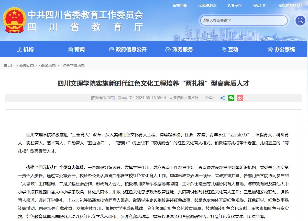 构建“双线融合”全方位育人体系。一是整合资源力量,创新红色文化育人形式。在官网、官微设置“红色文理”“文理教师讲党史”等栏目,并通过新媒体开展网上重走长征路、线上微党课、微视频等优秀互联网文化作品展播。创建“巴山红”专题红色文化网站,通过网络化、数字化技术手段将区域红色文化资源联网上线。开发设计“我的校友‘岁寒三友’”“重走红四方面军川陕革命路”等网络实践教学项目和数字化教学资源,现有网络教育资源超200GB,互动总量超过500万次;二是拓展线下阵地,丰富红色文化育人载体。优化和拓展校园红色文化育人阵地,设立美术馆、雁宁文学馆、校史陈列馆,建立四川省青少年文学艺术社科普及基地、四川巴文化普及基地等,定期举办红色文化艺术展演和创作普及活动,并将相关活动延伸到中小学校。将红色文化融入校园文化景观建设,分区分块打造特色校园文化,引导广大师生传承弘扬“艰难困苦,玉汝于成”的拼搏进取精神;组织青年学生参加脱贫攻坚、乡村振兴等社会实践活动,将学校“小课堂”与社会“大课堂”有效衔接起来,使校内校外育人资源和载体同向发力、协同育人。
