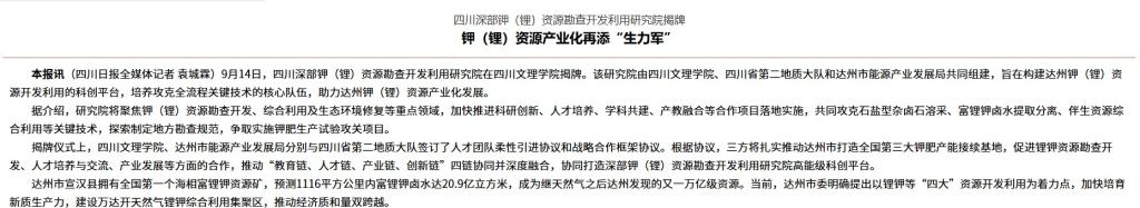 达州市宣汉县拥有全国第一个海相富锂钾资源矿,预测1116平方公里内富锂钾卤水达20.9亿立方米,成为继天然气之后达州发现的又一万亿级资源。当前,达州市委明确提出以锂钾等“四大”资源开发利用为着力点,加快培育新质生产力,建设万达开天然气锂钾综合利用集聚区,推动经济质和量双跨越。