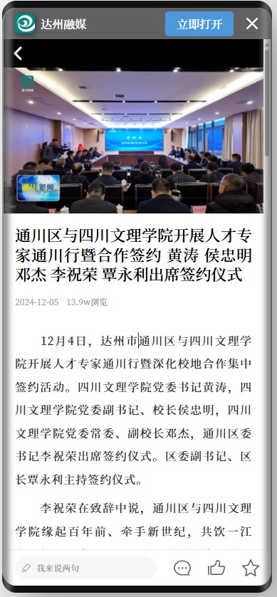 基础、实现了互促共进。此次集中签约,进一步拓宽了合作范畴、深化了彼此互信、实现了联动发力。在前进道路上,通川将认真履行协议,加强沟通、充分协作,让校地合作迈上更高台阶;我们真情期待校地同频共振、同心发力,在更高层次、更广领域,取得新的更大成就。