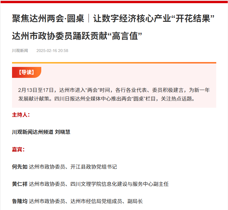 “围绕‘四大’资源开发利用,引育新质生产力。深挖‘算力+’‘+人工智能’,推进‘智改数转’和数据资源有效开发利用,促进数字经济核心产业产值和税收‘开花结果’。”2025年《达州市政府工作报告》中“加速破题新产业赛道”引起热议,不少市政协委员以此为议题,踊跃贡献“高言值”。