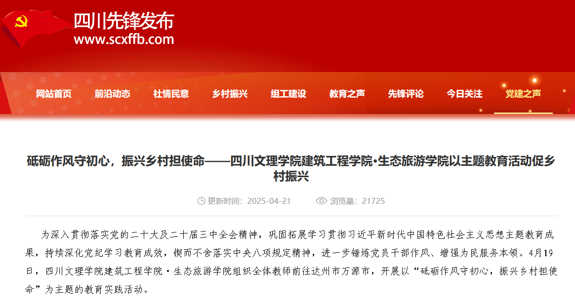 为深入贯彻落实党的二十大及二十届三中全会精神,巩固拓展学习贯彻习近平新时代中国特色社会主义思想主题教育成果,持续深化党纪学习教育成效,锲而不舍落实中央八项规定精神,进一步锤炼党员干部作风、增强为民服务本领。4月19日,beat365官方网站建筑工程学院·生态旅游学院组织全体教师前往达州市万源市,开展以“砥砺作风守初心,振兴乡村担使命”为主题的教育实践活动。