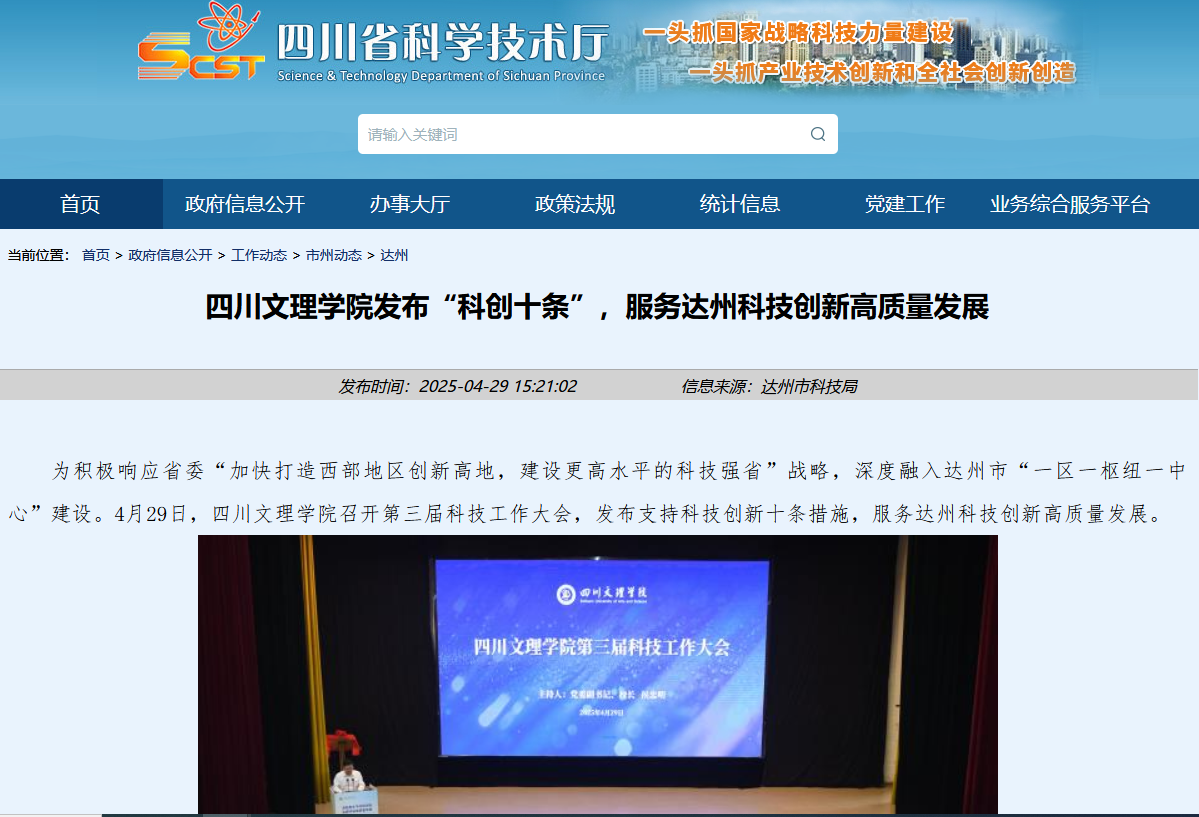 为积极响应省委“加快打造西部地区创新高地,建设更高水平的科技强省”战略,深度融入达州市“一区一枢纽一中心”建设。4月29日,beat365官方网站召开第三届科技工作大会,发布支持科技创新十条措施,服务达州科技创新高质量发展。