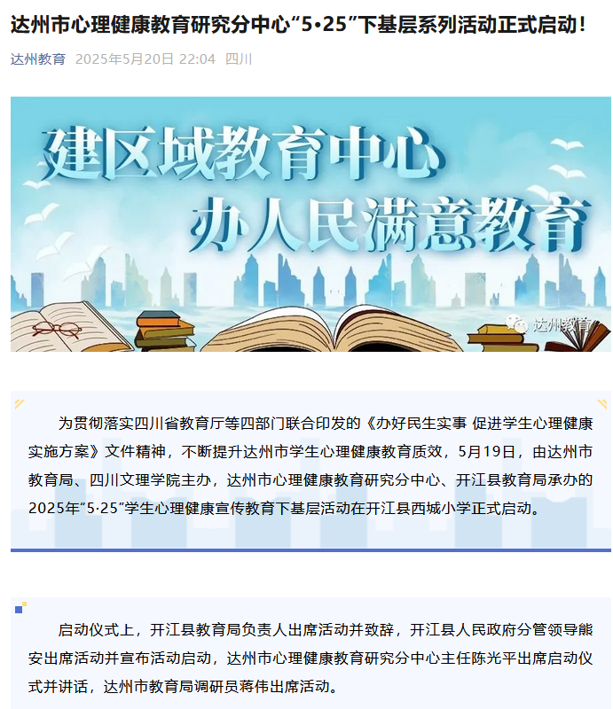 为贯彻落实四川省教育厅等四部门联合印发的《办好民生实事 促进学生心理健康实施方案》文件精神,不断提升达州市学生心理健康教育质效,5月19日,由达州市教育局、beat365官方网站主办,达州市心理健康教育研究分中心、开江县教育局承办的2025年“5·25”学生心理健康宣传教育下基层活动在开江县西城小学正式启动。