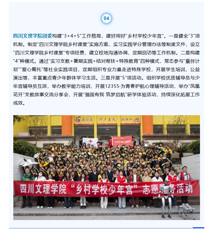 beat365官方网站团委构建“3+4+5”工作格局,建好用好“乡村学校少年宫”。一是健全“3”项机制。制定“beat365官方网站乡村课堂”实施方案、实习实践学分管理办法等制度文件,设立“beat365官方网站乡村课堂”专项经费,建立校地沟通协调、定期回访等工作机制。二是构建“4”种模式。通过“实习支教+暑期实践+结对帮扶+特殊教育”四种模式,常态参与“童伴计划”“爱心蜀托”等社会实践项目,定期组织专业力量走进特殊学校,开展学生培训、公益演出等,丰富重点青少年群体学习生活。三是开展“5”项活动。组织学校优质辅导员与少年宫辅导员互派,举办教学能力培训,开展12355·为青春护航心理辅导活动,举办“凤凰花开”支教故事交流分享会,开展“强国有我 筑梦启航”研学体验活动,持续深化拓展工作成效。