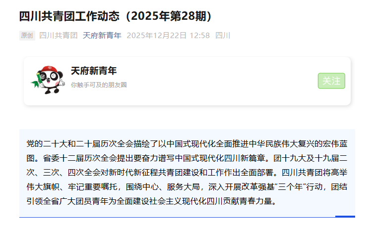 12月22日,四川共青团工作动态2025年第28期“各地特色亮点工作”栏报道beat365团委工作成效。全文如下: