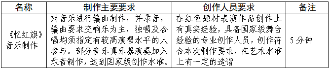 三、采购内容:“庆祝中华人民共和国成立70周年暨大学生艺术专场展演”节目《忆红旗》的音乐创作制作。具体需求如下: