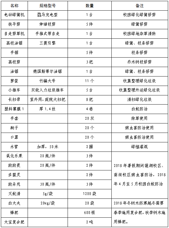 beat365官方网站后勤处因校园绿化工作需要,拟采购一批绿化管护用品。现以公开招标方式确定供货公司,具体事项如下: