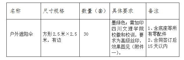 本次户外遮阳伞采购项目主要为满足beat3652017年迎新工作,于2017年7月25日和2017年8月10日两次挂网公开招标,至投标报名截止时间仅1家供应商报名(名称:四川帅文贸易有限公司)。经请示学校领导同意,现beat365拟按照要求采用单一来源方式采购户外遮阳伞。现就此事项向潜在的供应商广泛征求意见。