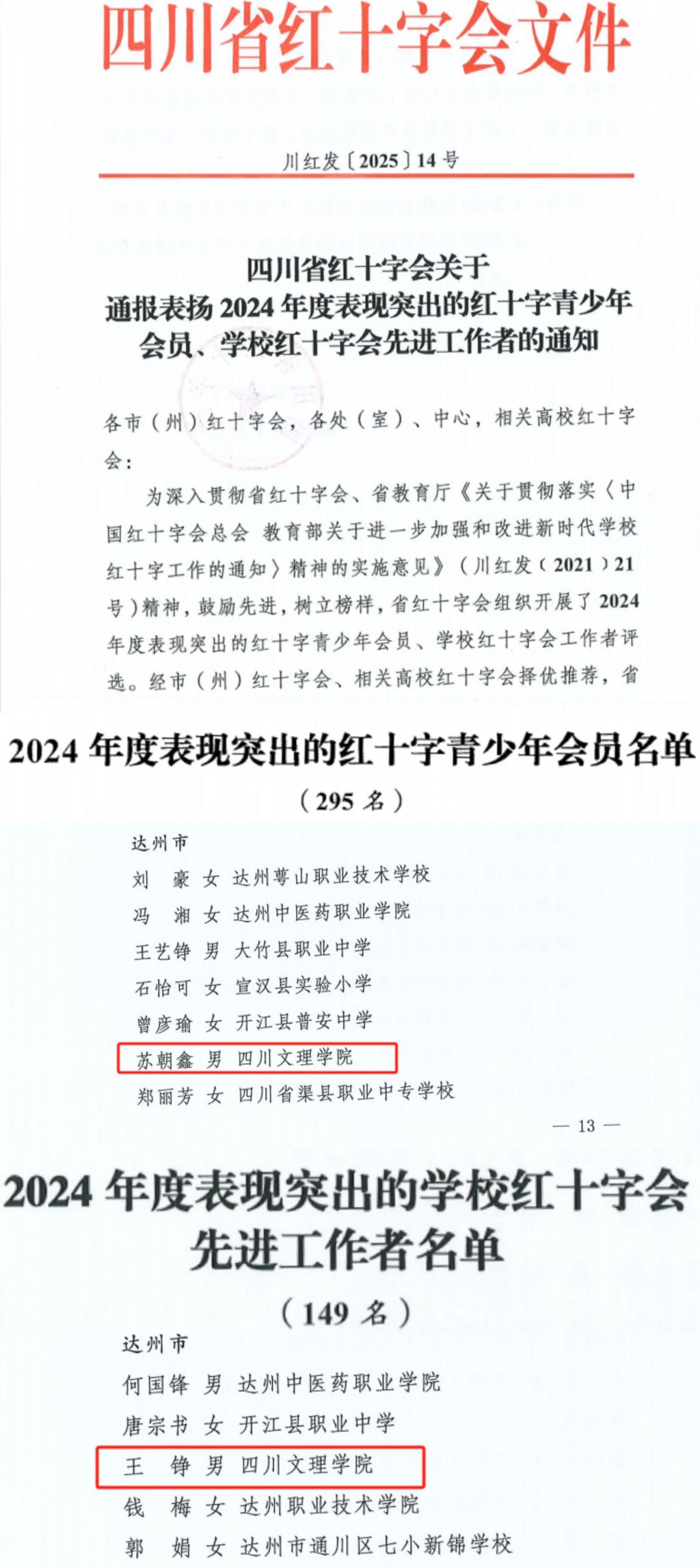近日,四川省红十字会发布《关于通报表扬2024年度表现突出的红十字青少年会员、学校红十字会先进工作者的通知》,后勤服务处校医院王铮老师凭借在红十字工作中的突出贡献,荣获“2024年度表现突出的学校红十字会先进工作者”称号。该同志长期致力于红十字青少年工作,在应急救护培训、志愿服务组织等方面取得显著成效。同时,beat365苏朝鑫同学以出色的公益实践荣获“2024年度表现突出的红十字青少年会员”称号,彰显了新时代文理学子的青春力量。