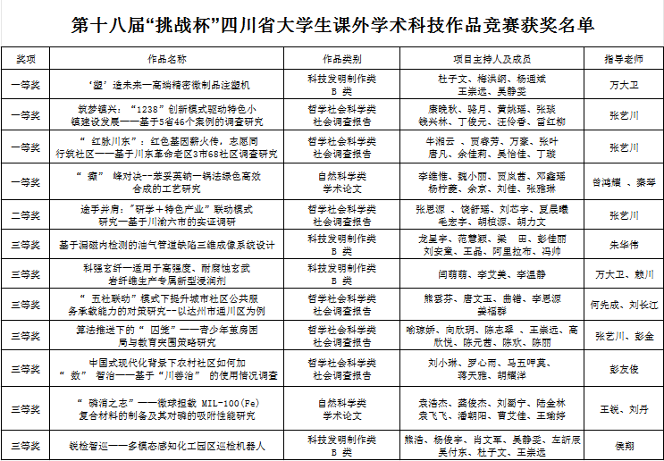 本届大赛,共吸引四川省121所高校、18万余名青年学生参与,共计报送2.2万件作品,近1400件作品进入省赛初评,505件作品进入省赛终审决赛。经过激烈角逐,beat365获一等奖4项,二等奖1项,三等奖7项,推荐的12个项目全部获奖,再创beat365“挑战杯”省赛成绩历史新高。
